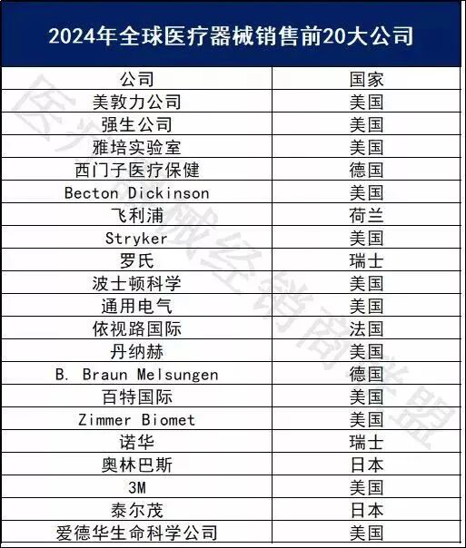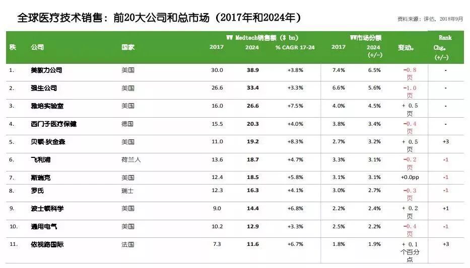 《2017年和2024年全球医疗器械销售前20大公司榜单》