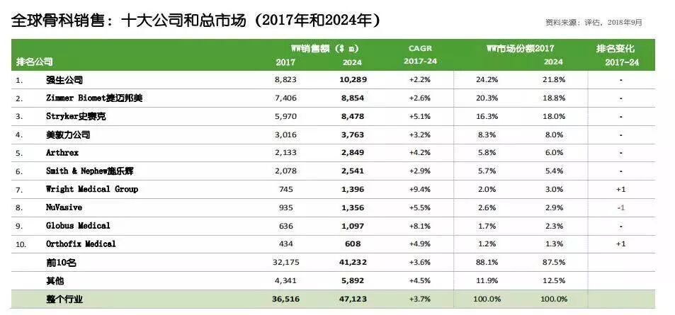 《2024年全球骨科医疗器械销售前10大公司榜单》